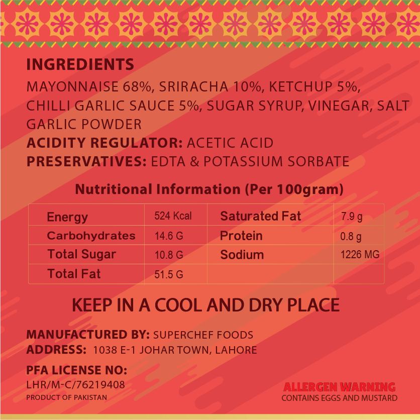 Mayonnaise 68%, Sriracha 10%, Ketchup 5%, Chilli garlic sauce 5%, Sugar syrup, Vinegar, Salt