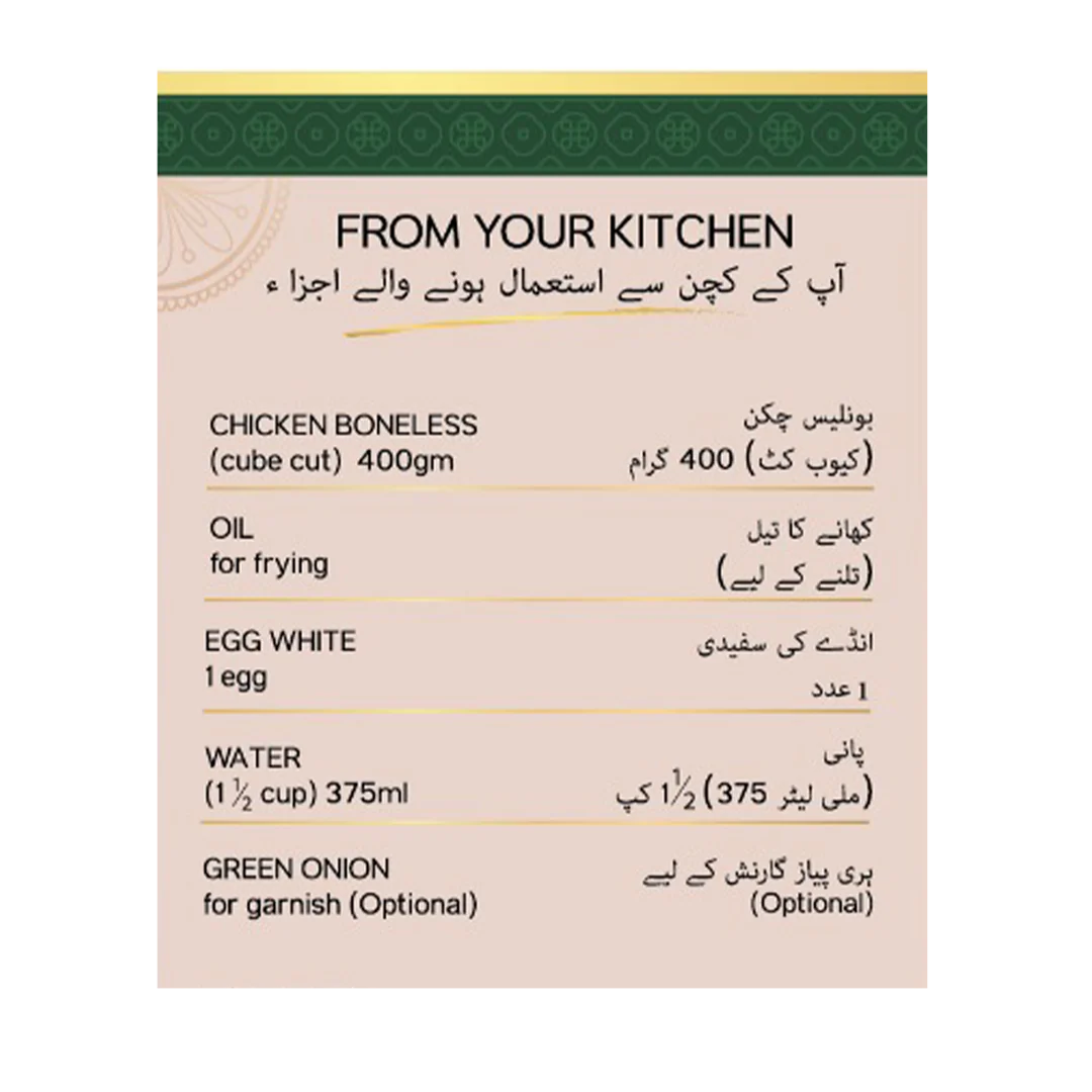 IN A BOWL, MIX THE CHICKEN WITH THE GIVEN PACK OF DRY POWDER AND EGG WHITE. LET IT REST FOR 15-20 MINS. DEEP FRY THE CHICKEN IN HOT OIL FOR 3-4 MINUTES UNTIL IT'S LIGHTLY GOLDEN, THEN SET IT ASIDE.
