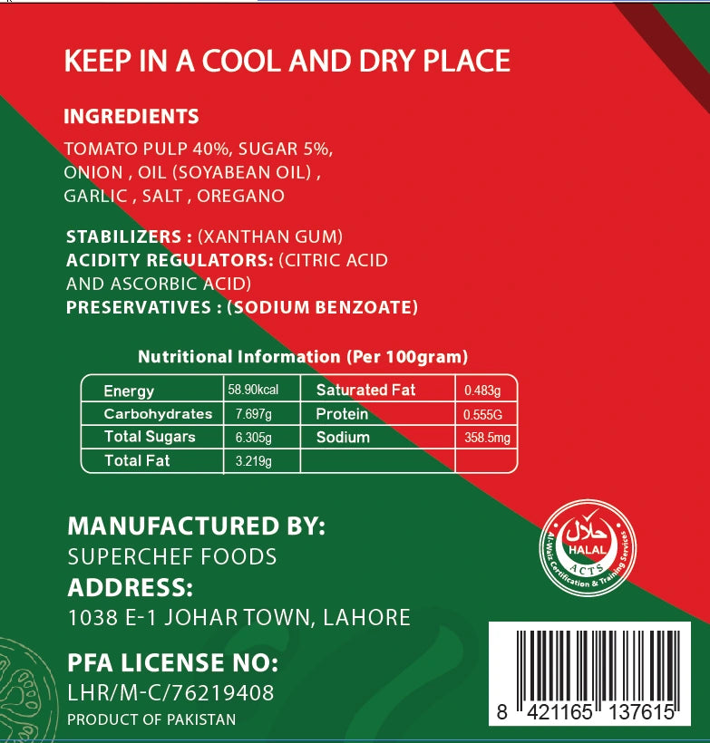 Whether you are making classic Margherita, cheesy loaded pizza, or fusion recipes, SuperChef Pizza Sauce provides the perfect base with smooth texture, vibrant color, and authentic Italian taste. It spreads easily and bakes beautifully, giving your pizza a delicious aroma and deep flavor.
